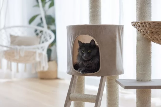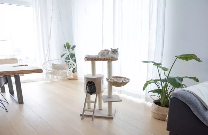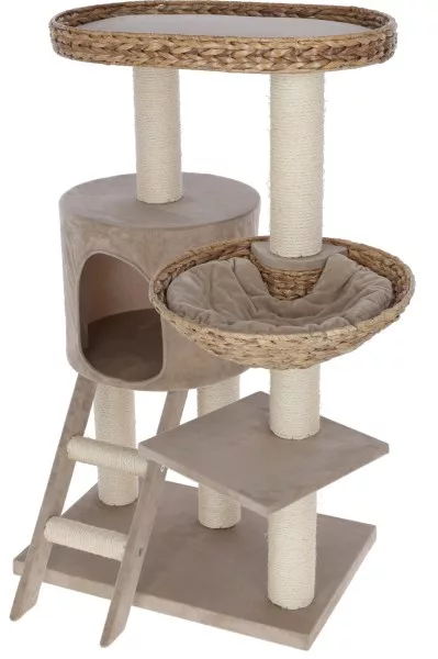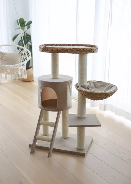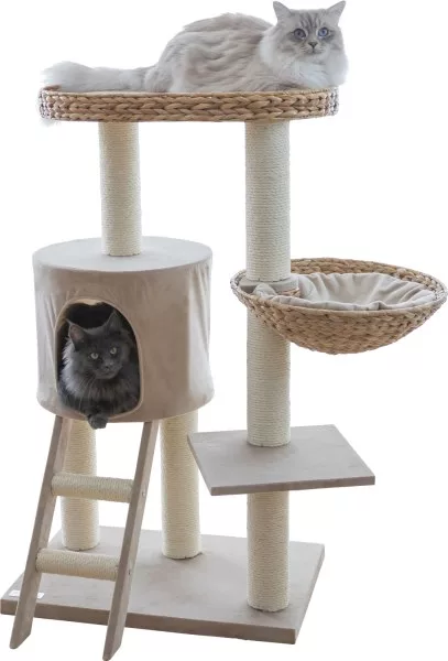 Les poteaux sont enveloppés de sisal naturel (ø 5,6 mm) soigneusement collé, servant de surface de grattage irrésistible tout en protégeant vos meubles.